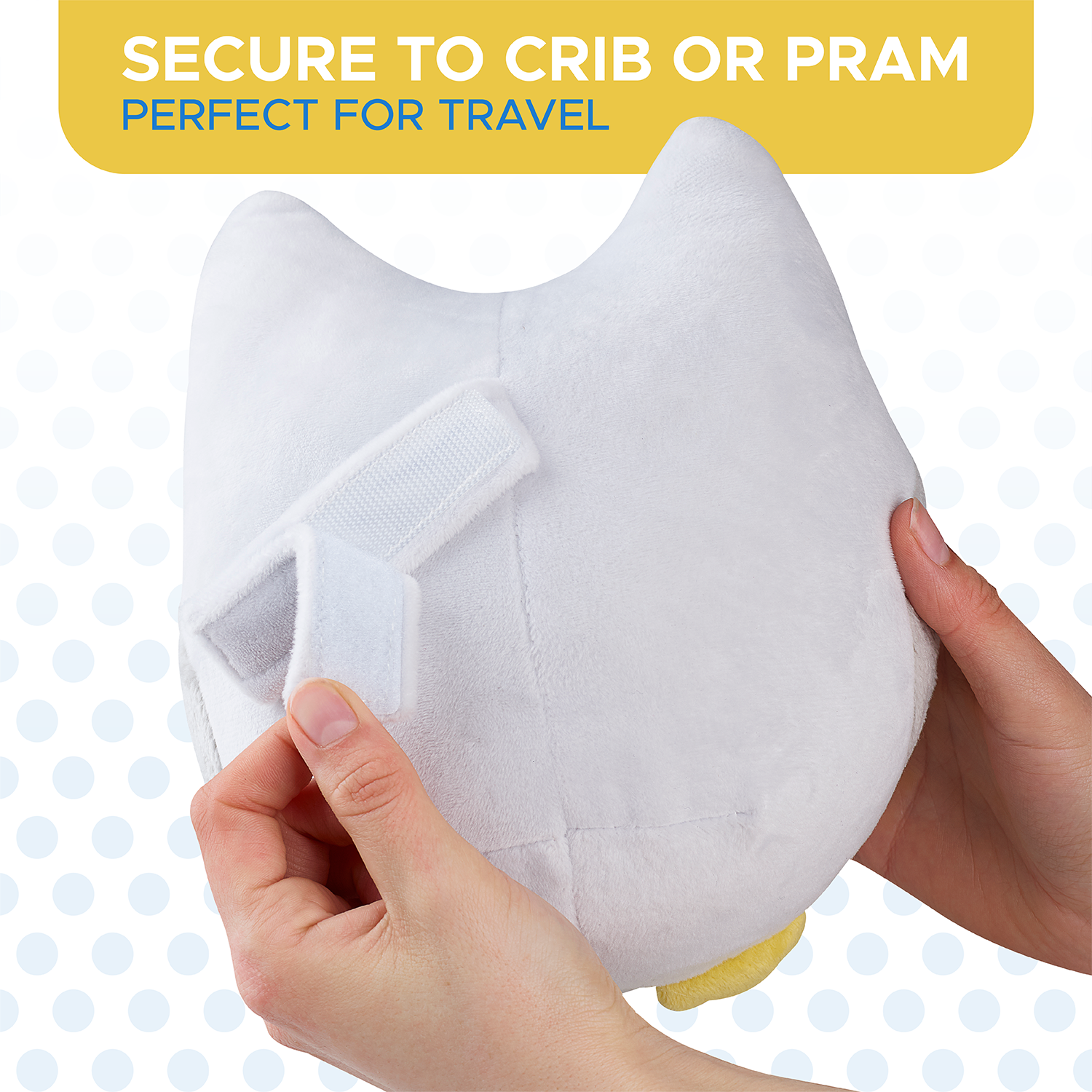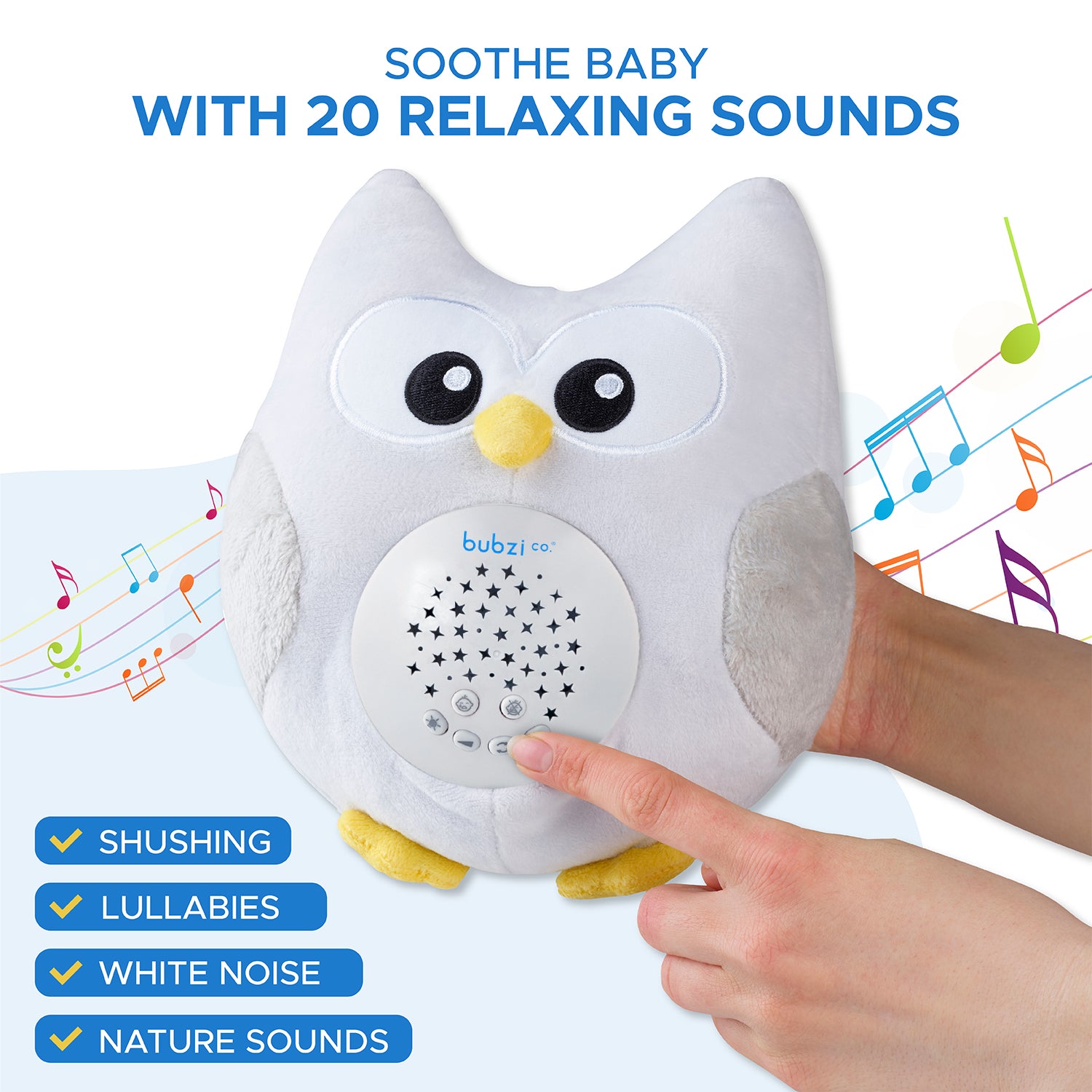 The Owl plays 10 different instrumental songs such as; Minuet, Brahms Lullaby, Are You Sleeping, Baa Baa Black sheep, Home Sweet Home, American Patrol, Mary has a Little Lamb, Oh My Darling, London Bridge is Falling Down, and Hush Little Baby. It also includes white noise, a natural bird song and a heartbeat sound to calm and settle your baby.